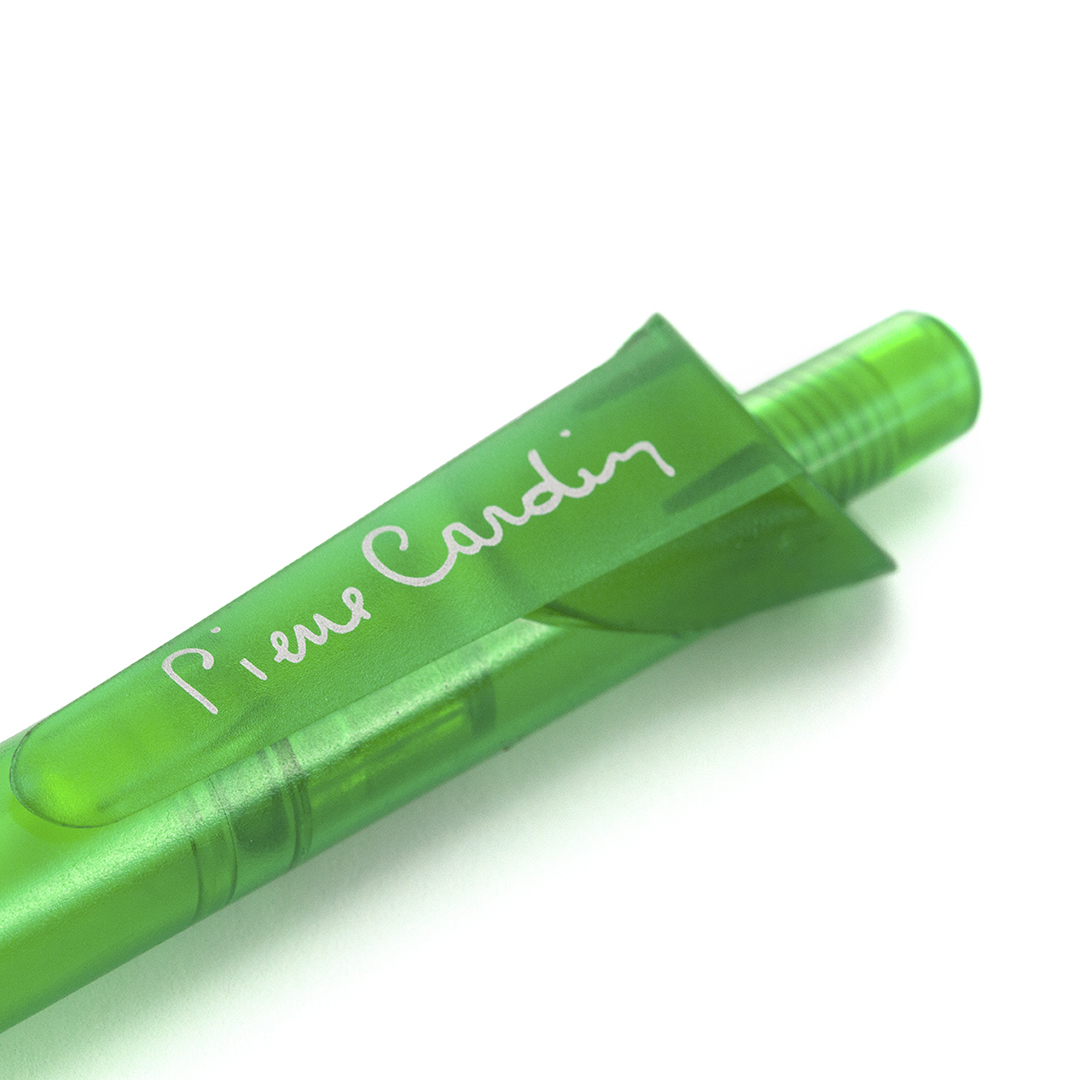 Esferográfica Pierre Cardin com um design original e um corpo macio com acabamento translúcido em cores vivas. Com acessórios correspondentes e o logótipo da marca no clip. Punho de borracha confortável, cartucho enorme e tinta azul.