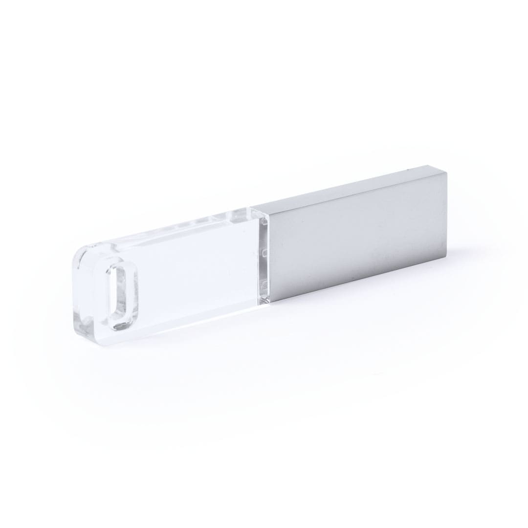 Memória USB de 16 GB de capacidade, com corpo numa combinação de alumínio e material acrílico transparente que é iluminado com luz branca quando conectado à porta USB. Apresentado em caixa individula de PVC com um interior recortado de espuma macia.