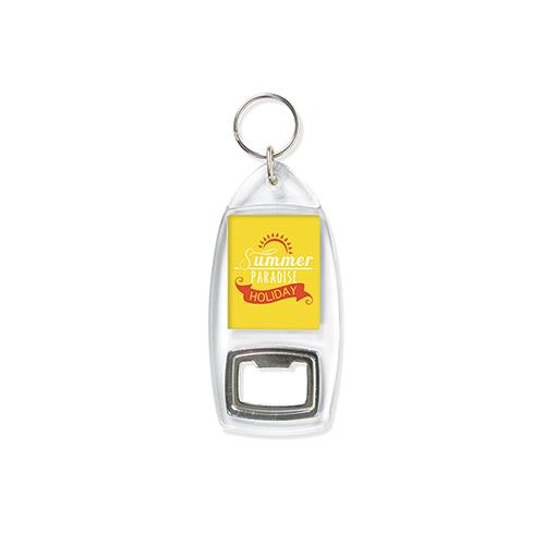 Porta-chaves em acrílico com formato retangualr que engloba um abre cápsulas.