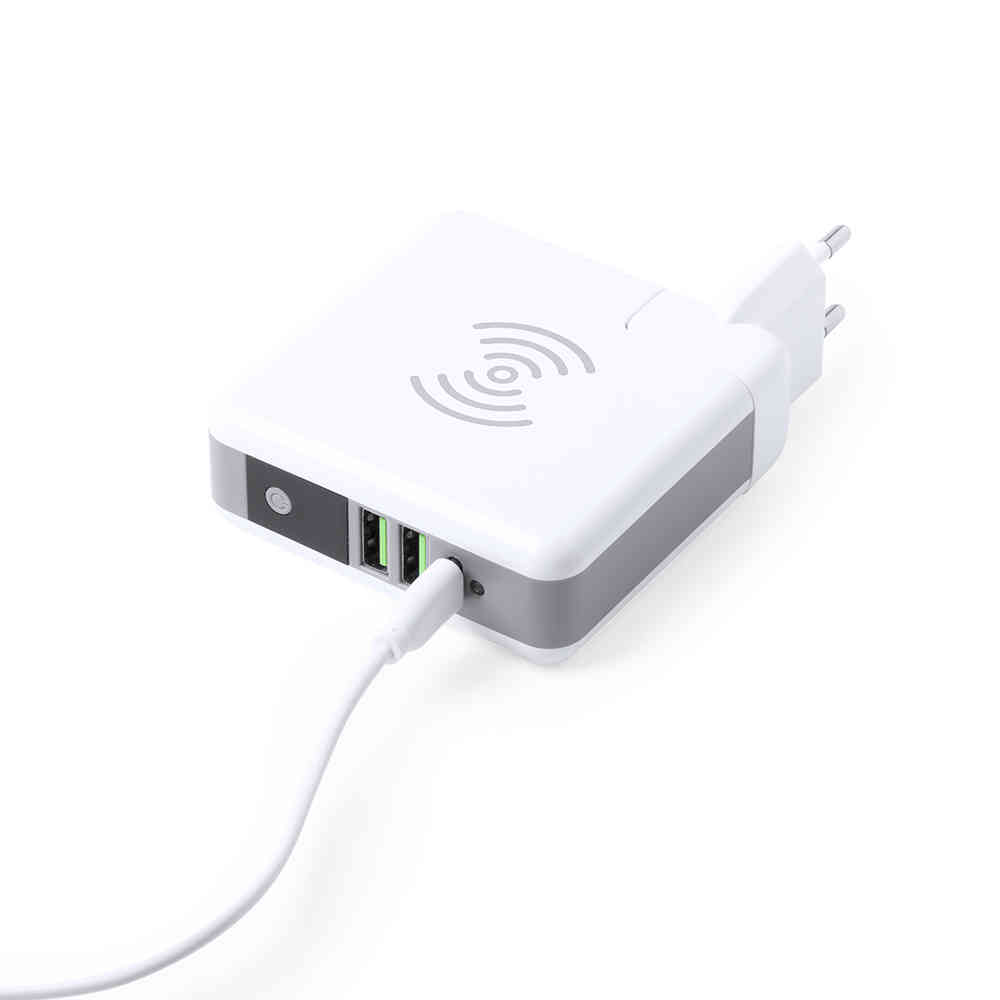 Adaptador de viagem sem fio, multi-funcional e de várias saídas com banco de potência integrado com capacidade de carga de 6.700 mAh. Com um design branco elegante e uma grande superfície de marcação. Função de carregamento sem fio, conexão de entrada e saída de corrente dupla de 3.000 mA Tipo C e 2 saídas USB de 2.400 mA. Tela LCD com indicador de status de carga e adaptadores de tomada para EUA, Europa, Ásia, Reino Unido e Austrália. Uso simultâneo para todas as funções. Apresentado em uma atraente caixa de design.