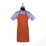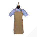 Avental de peito em sarja. Fita à volta do pescoço ajustável com fivela em plástico. Duas fitas nas extremidades para ajustar à cintura. Bolso central.