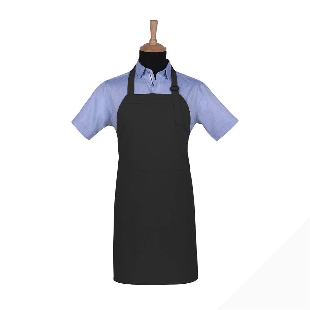 Avental de peito em sarja. Fita à volta do pescoço ajustável com fivela em plástico. Duas fitas nas extremidades para ajustar à cintura. Bolso central.