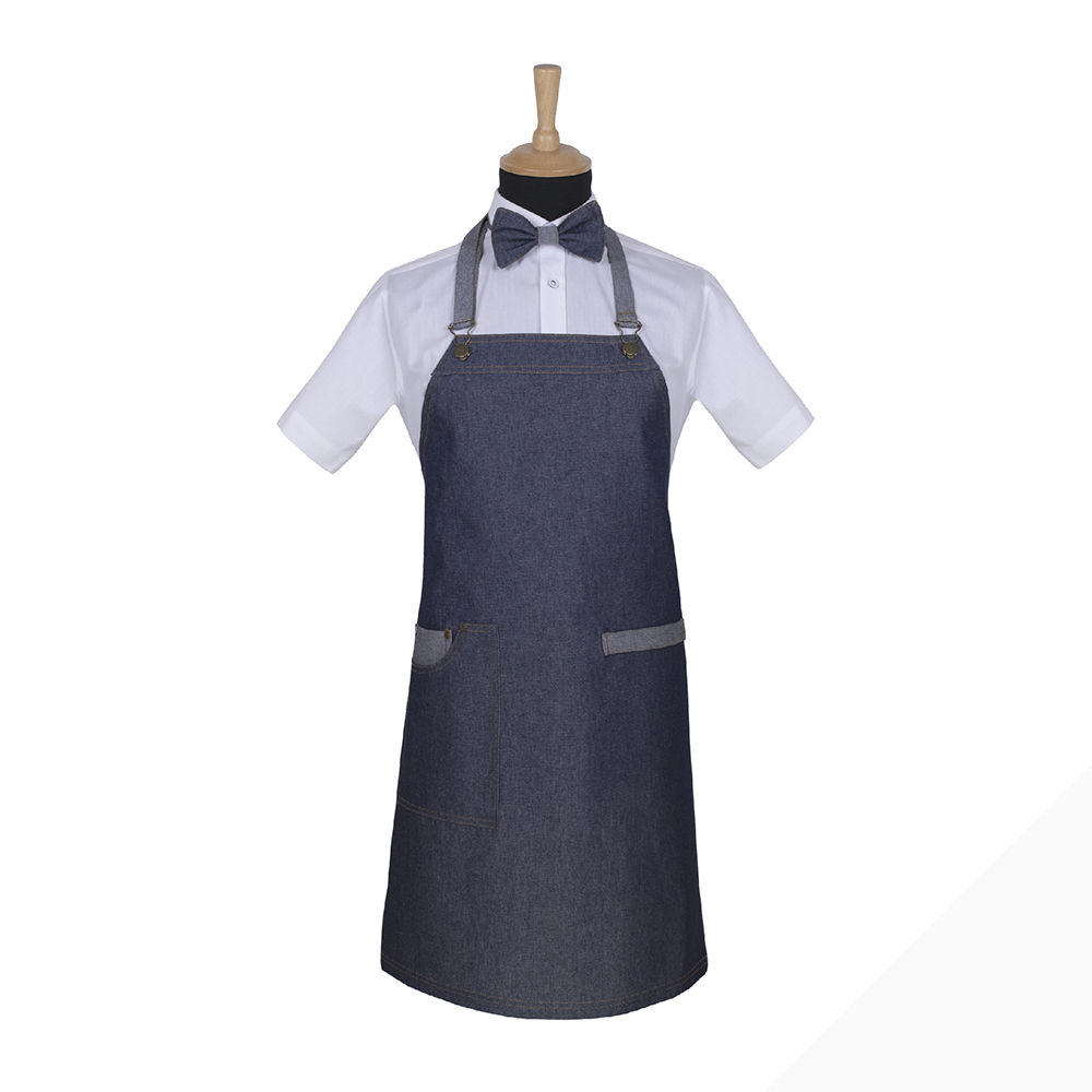 Avental de peito em ganga. Fita em contraste à volta do pescoço ajustável com jardineiras metálicas. Duas fitas em contraste nas extremidades para ajustar à cintura. 2 bolsos: 1 bolso lateral estilo calça de ganga; 1 bolso lateral pequeno para canetas/saca rolhas. Tira lateral para pendurar o pano.