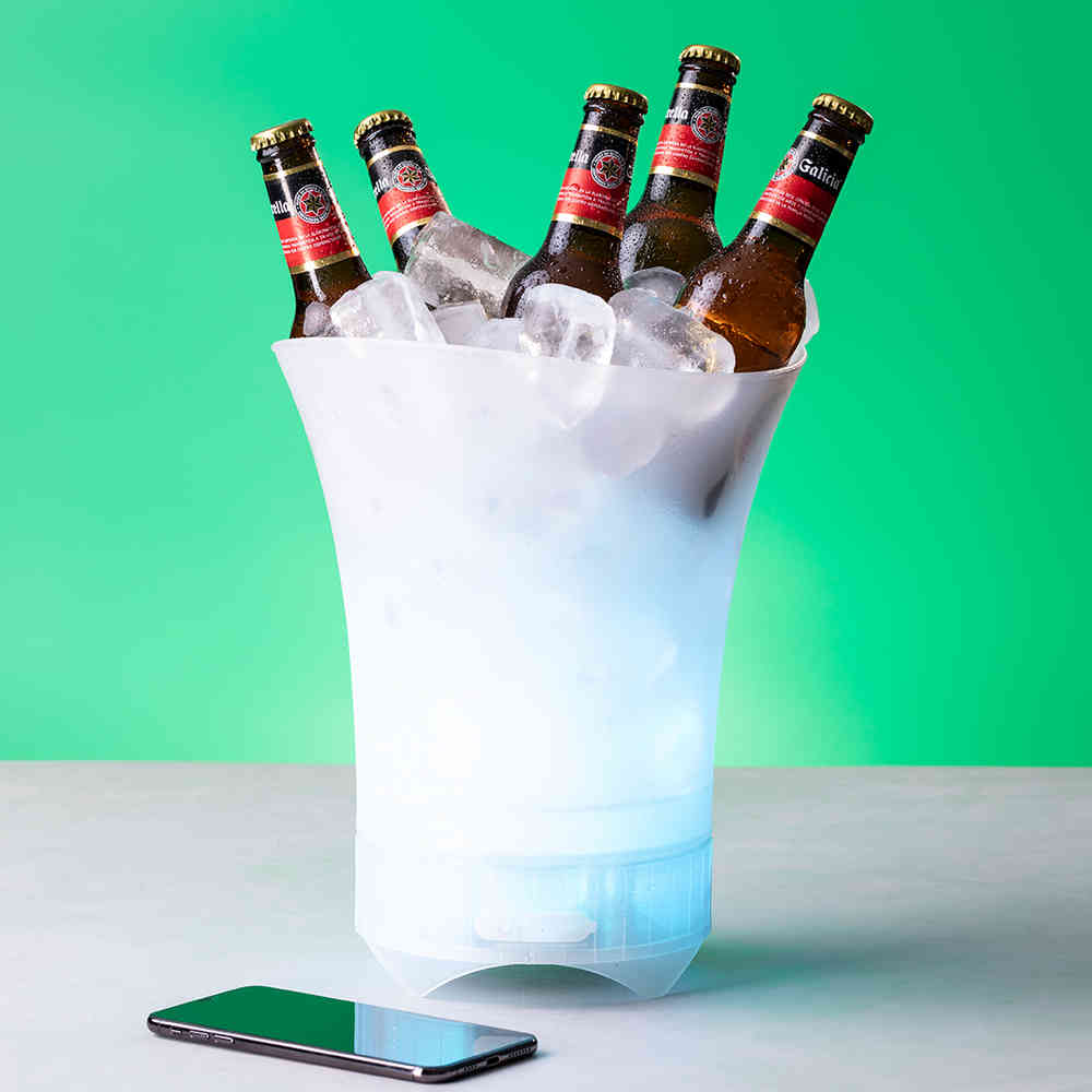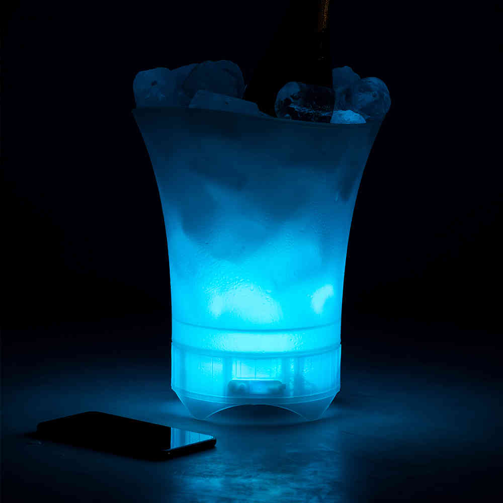 Balde de gelo original com coluna de som poderoso embutido na base. Em material de acabamento translúcido resistente e com conexão Bluetooth® 5.0, oferece mais do que respeitável 5W de potência. Com iluminação LED inteligente no interior que acompanha a música. Recarregável via cabo micro USB (incluído) e apresentado em uma atraente caixa de design.