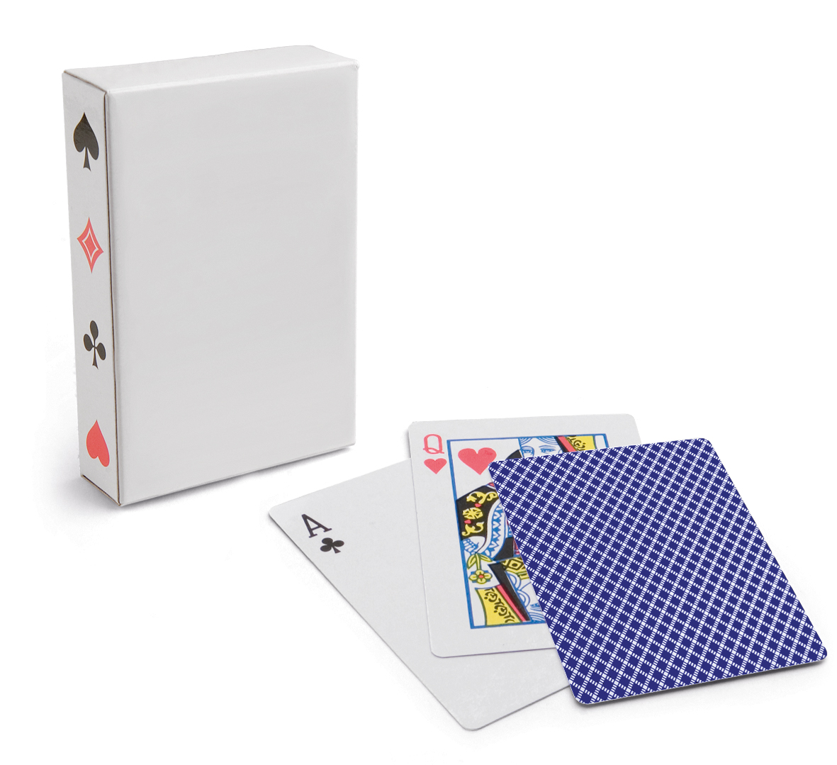 Baralho de 54 cartas. Papel plastificado. Em caixa de papel.