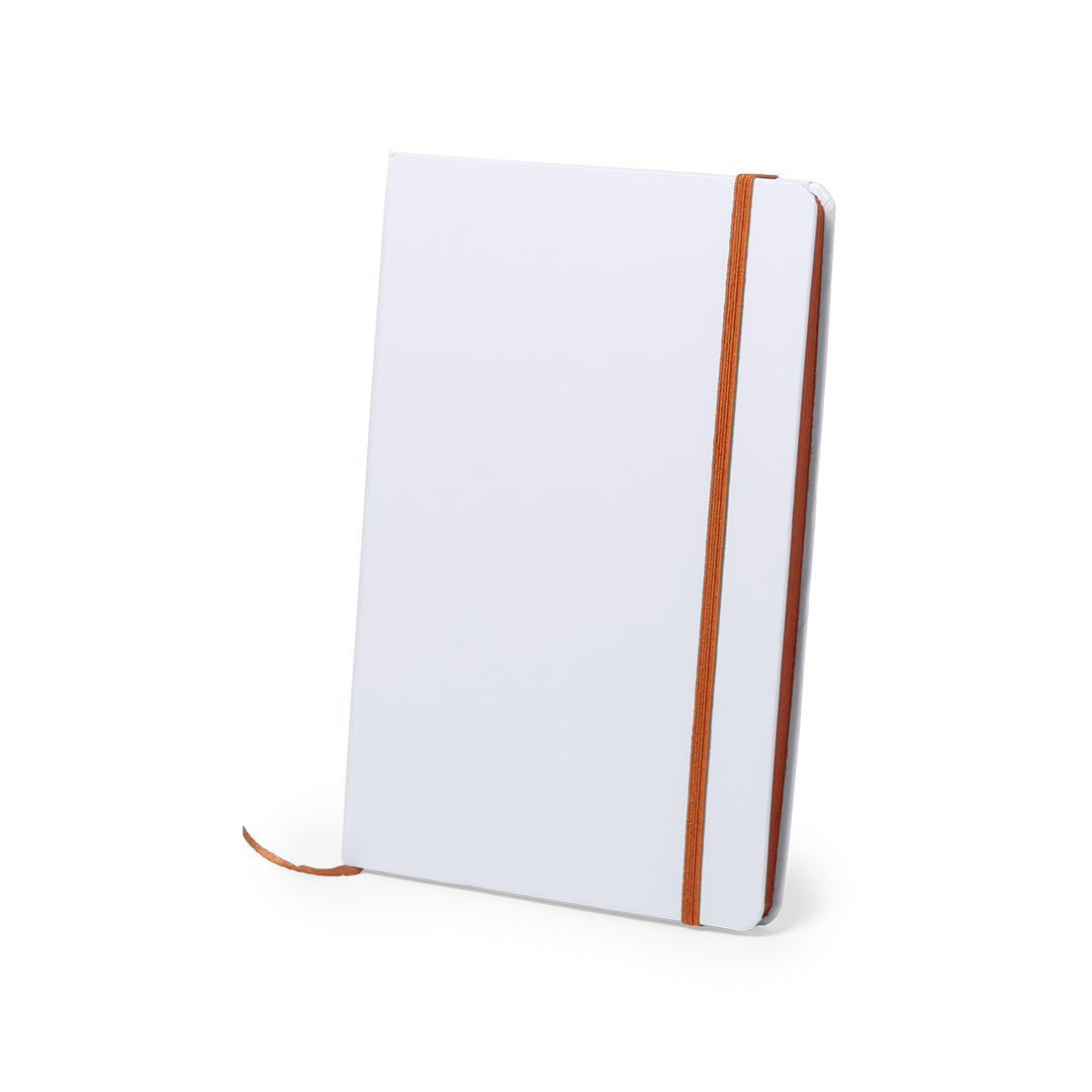 Bloco de notas com capas rígidas de toque suave com acabamento em branco. 100 folhas planas com lombada em cores divertidas, fixação elástica e marcadores de tecido correspondentes.