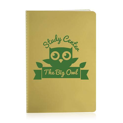 Bloco ecológico, cosido na lombada. Tamanho A5, 40 folhas lisas de 70 gramas com capa em cartão e costura branca visível na lombada.