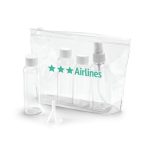 Nécessaire hermético em PVC que inclui 3 frascos (2 x 65 ml e 60 ml), 1 vaporizador (80 ml) e 1 funil. Apropriado para viagens de avião.