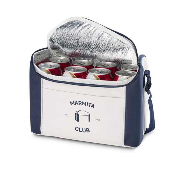 Bolsa térmica em poliéster 600D com alça ajustável em webbing e bolso frontal. A bolsa tem capacidade até 8 latas de 0,5 L.