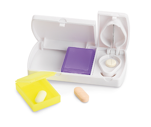 Caixa de comprimidos com cortante e 2 divisórias interiores extraíveis.