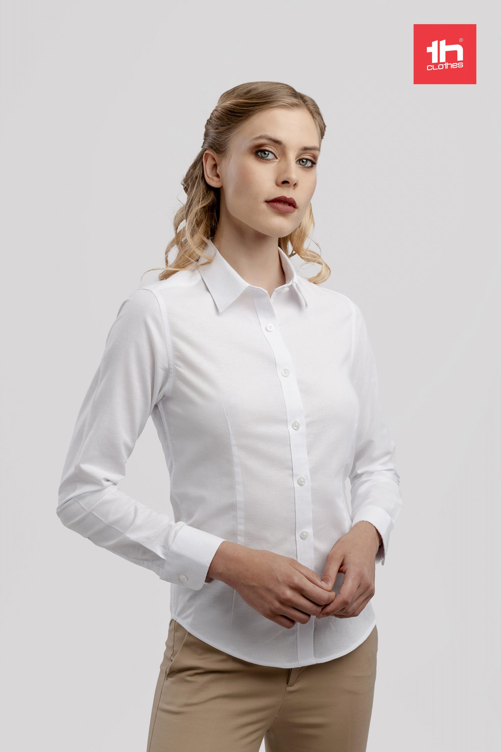Camisa Oxford Manga Comprida Tokyo - Mulher. 70% algodão | 30% poliéster. Corte cintado, punhos ajustáveis com 2 botões, carcela com 7 botões. Gramagem 130g/m².