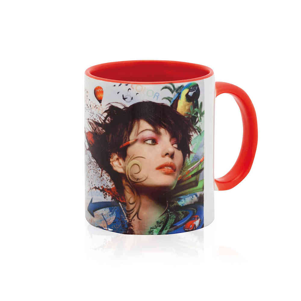 Caneca de cerâmica de 350ml de capacidade com exterior em cor branco e interior em vivas e variadas cores. Especialmente desenhada para sublimação.