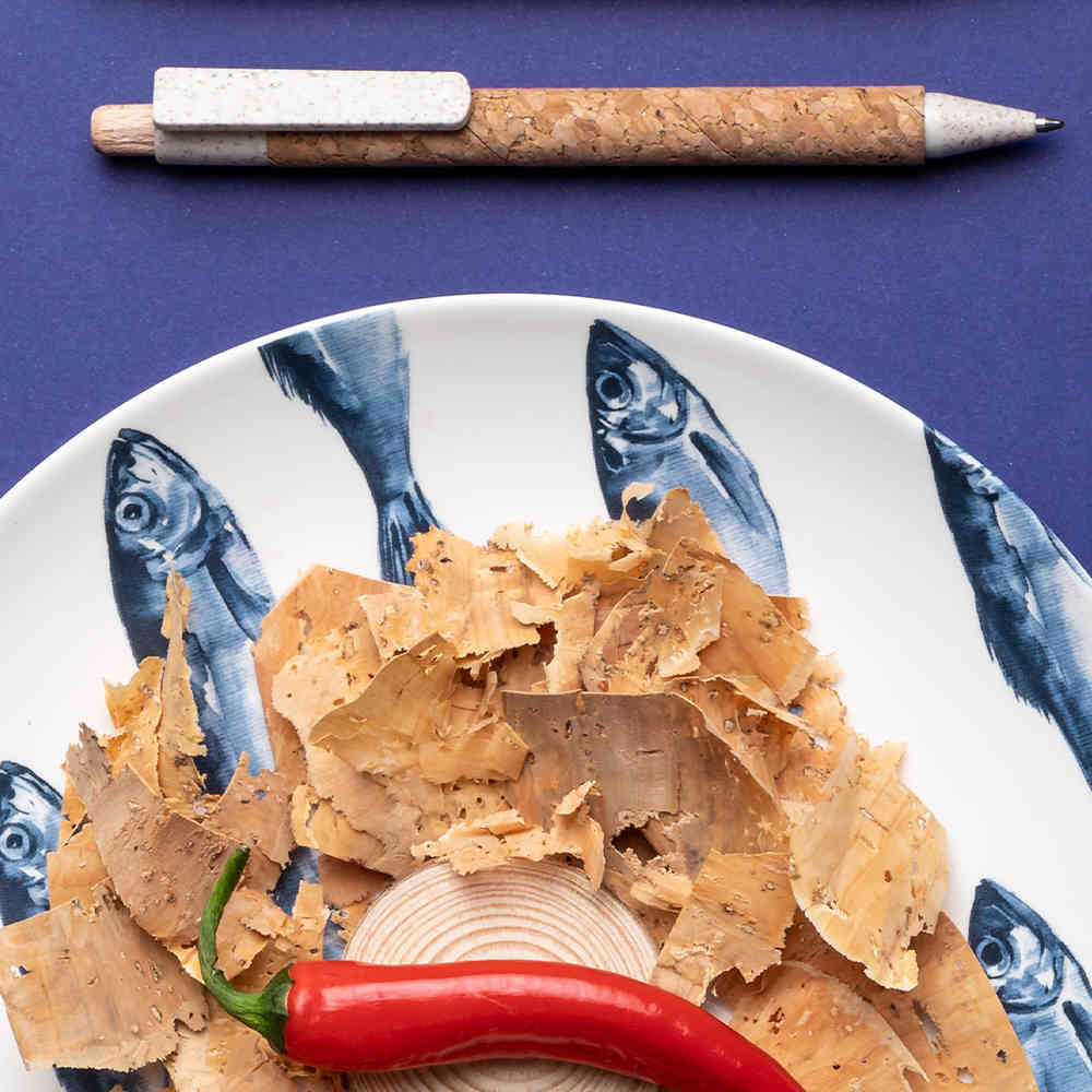 Caneta da linha Nature com corpo de cortiça natural. Grampo, ponta e botão na cana de trigo, a fim de promover o uso de matérias-primas naturais e reduzir as emissões de poluentes. Com clipe especialmente projetado para impressão em bloco. Com mecanismo de pressão e tinta azul.