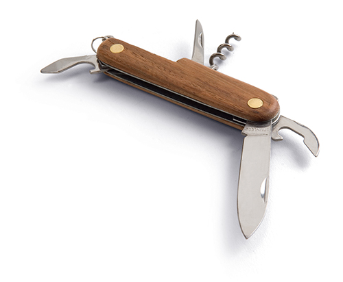 Canivete multifunções. Aço inoxidável e madeira. Com 5 funções.