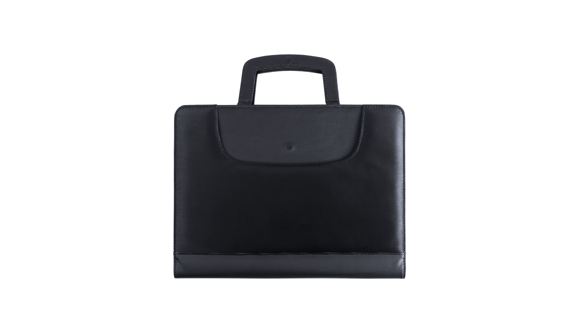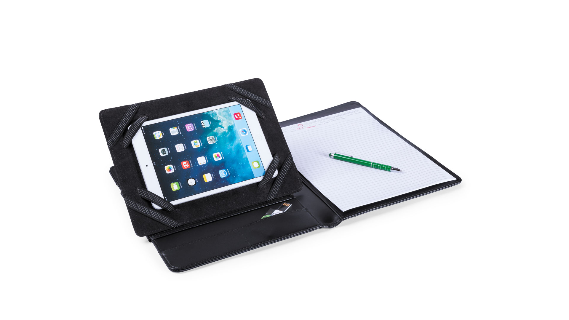 Capa de pasta A4 elegante em couro macio e acolchoado para tablets de até 12 polegadas. Com alças magnetizadas práticas e luva de suporte interna removível de 360º para tablets com diferentes posições. Inclui bloco removível de 20 folhas com layout de listras e suporte para caneta. Apresentado em uma elegante caixa preta.
