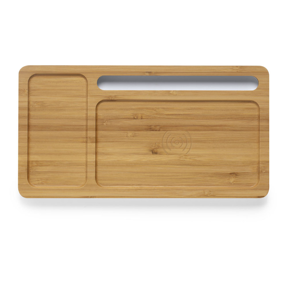 Carregador/organizador Wireless da linha Nature com função de suporte para smartphone. Saída USB (cabo incluído) de 1.000 mA. Permite carregar até 2 dispositivos simultaneamente (1 via carregamento sem fio e 1 via cabo). Feito de bambu a partir de cortes naturais, com bandeja de objetos cortados. Compatível com dispositivos equipados com a tecnologia de carregamento sem fio. Grande superfície de marcação e apresentada em uma atraente caixa de design ecológico.