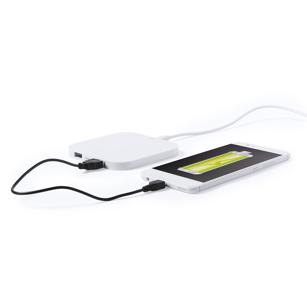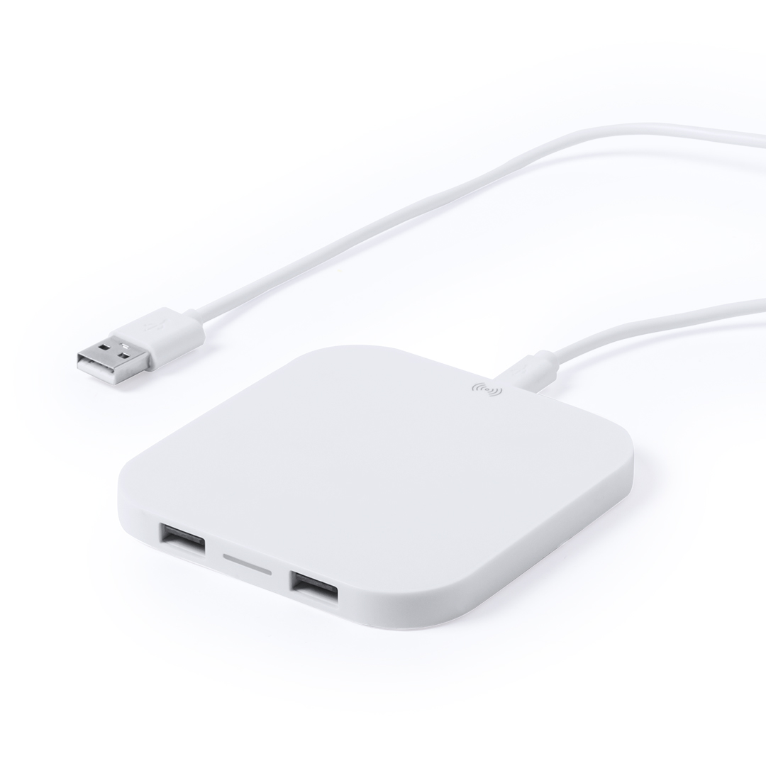 Carregador sem fio de design minimalista de cor branca. Com saída USB dupla extra de 2.100 mA para carregamento simultâneo de dois dispositivos. Com base antiderrapante. Compatível com dispositivos equipados com tecnologia de carregamento sem fio e apresentados em uma atraente caixa de design.