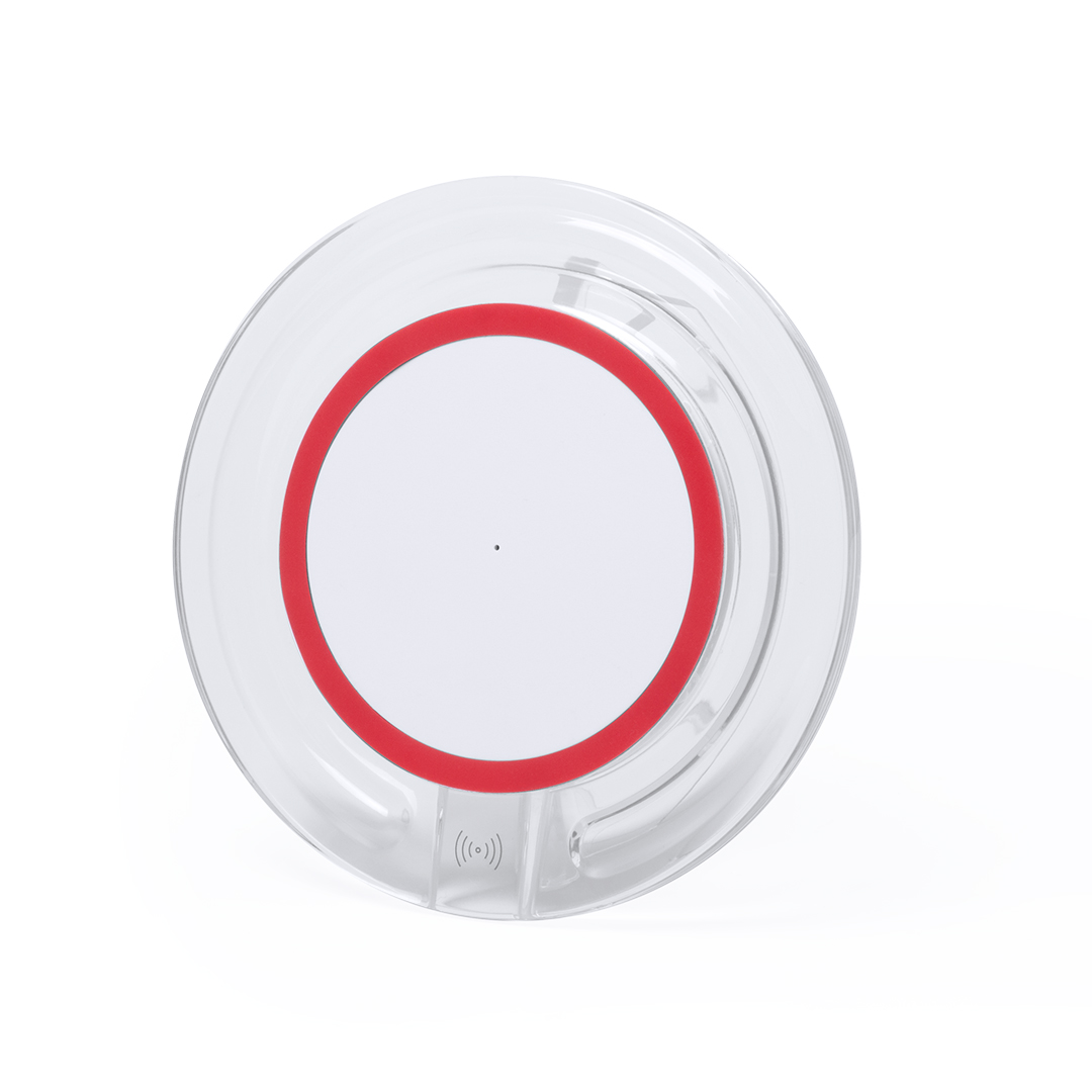 Carregador sem fio circular. Corpo transparente com detalhes numa ampla gama de cores brilhantes. Com base antiderrapante e LED indicador de status de carga. Compatível com dispositivos equipados com tecnologia de carregamento sem fio e apresentados em uma atraente caixa de design.