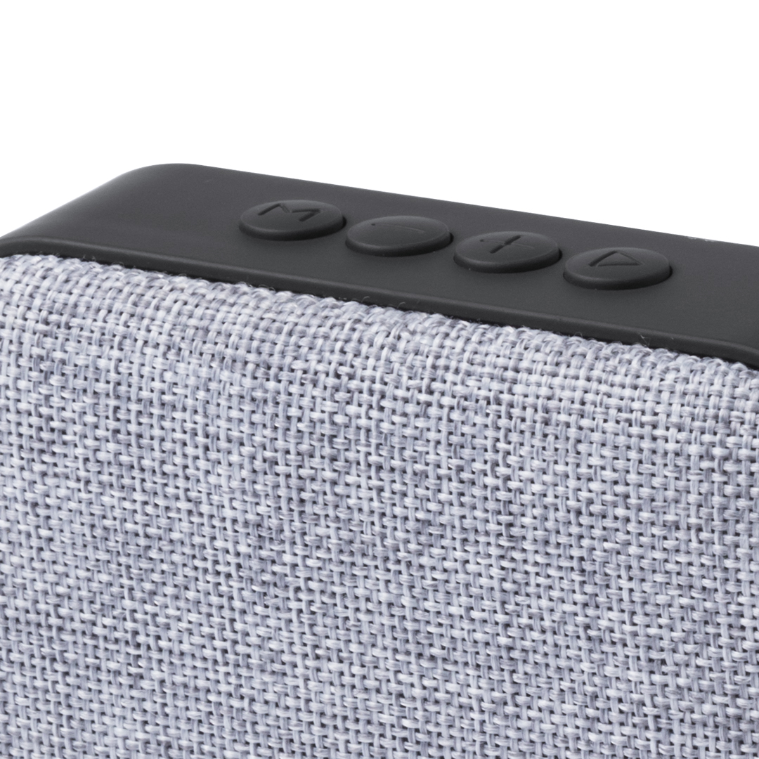 Altifalante de conexão Bluetooth. Em tecido de poliéster bicolor e corpo com acabamento em borracha macia. Oferece 3W de potência, possui uma função viva-voz, um slot para cartões micro SD de até 32 GB de capacidade. Compatível com iOS e Android, inclui um cabo de carregamento micro USB e é apresentado em uma caixa de design individual. Com suportes de borracha antiderrapante na base.