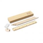Conjunto de 6 peças com 3 lápis de madeira com corpo redondo natural e chumbo preto, régua de 20cm com sistema métrico em centímetros / polegadas, borracha e apontador. Apresentado em caixa de papelão reciclado.
