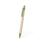 Conjunto de caneta esferográfica e caneta mecânica, em uma combinação original de corpo em papelão reciclado de cor natural e acessórios em verde. Apresentado em caixa individual de papelão reciclado. Esferográfica de tinta azul e lapiseira com pontas de 0,5 mm incluídas.