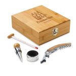Conjunto para vinho. Bambu e zinco. Saca-rolhas com canivete de escanção, termómetro, rolha e gargantilha.