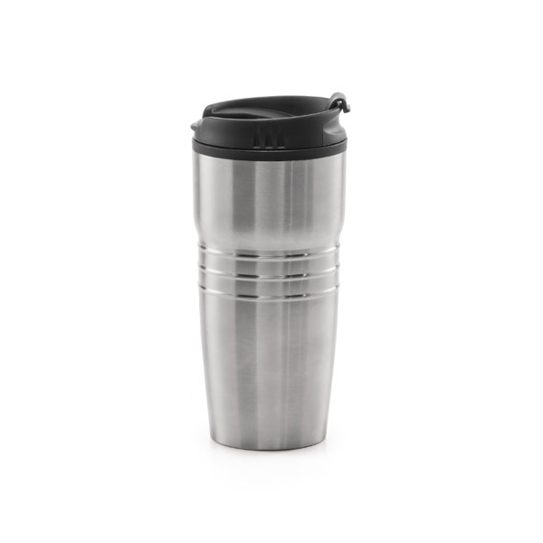 Copo de viagem, Com corpo duplo, tampa e antideslizante na base. Capacidade até 520 ml.