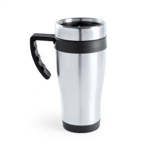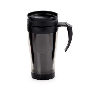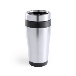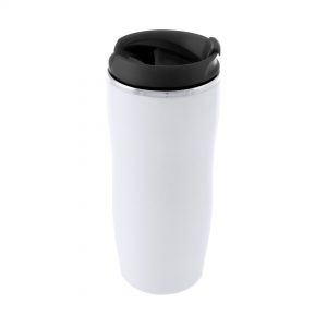 Copo de viagem. Aço inoxidável e PP. Com corpo duplo e tampa. Capacidade até 420 ml.