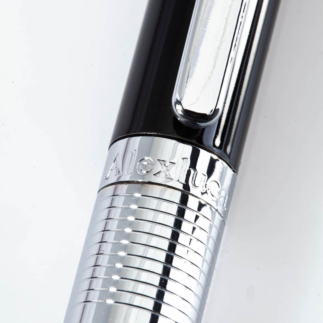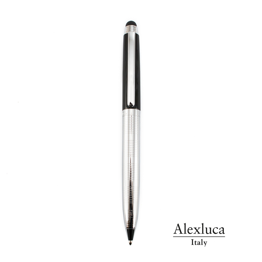 Esferográfica de Alexluca com corpo de metal macio, numa elegante combinação de cores em prata e preto. Clip e alça de design correspondentes. Apresentado em estojo individual preto com o logótipo da marca. Tinta azul.