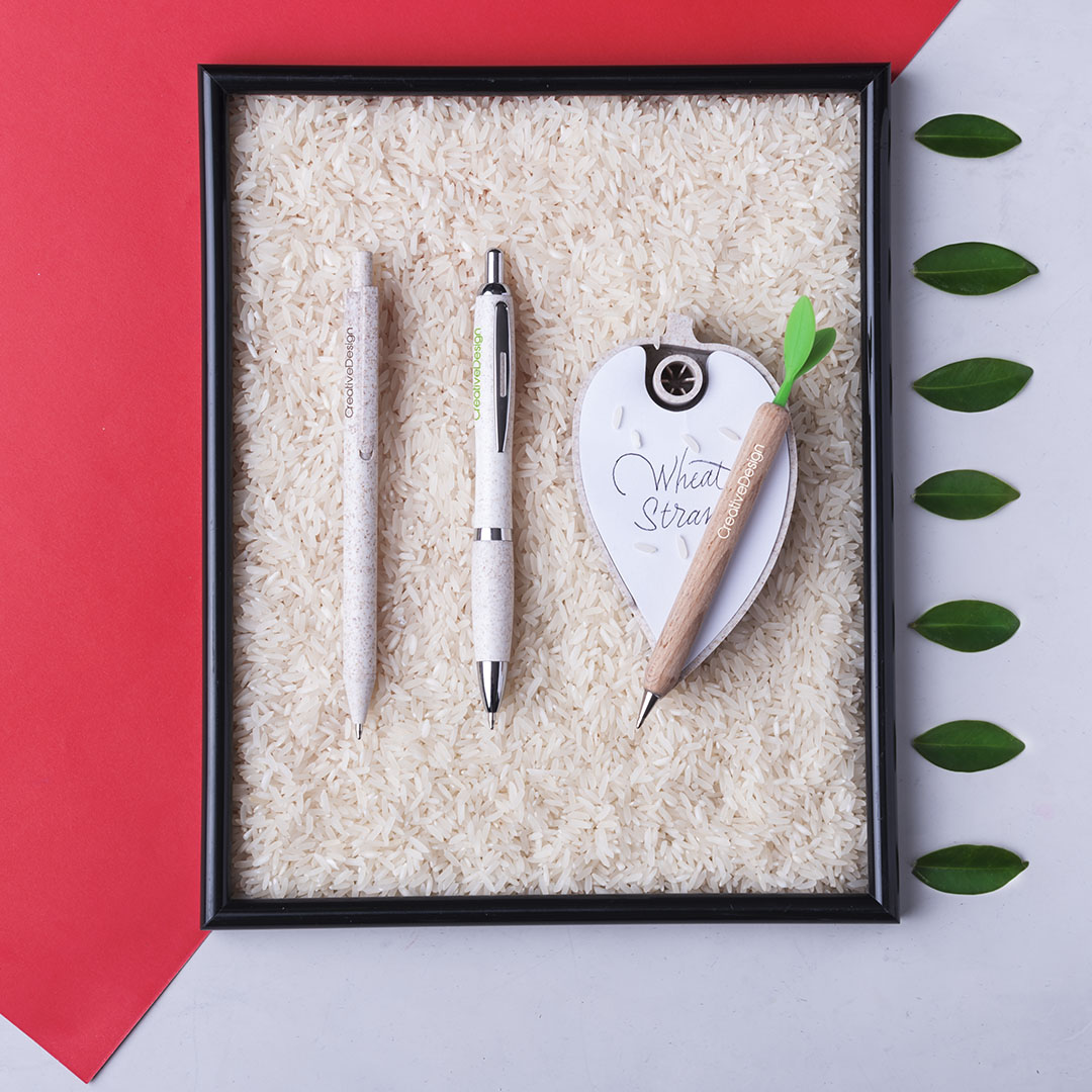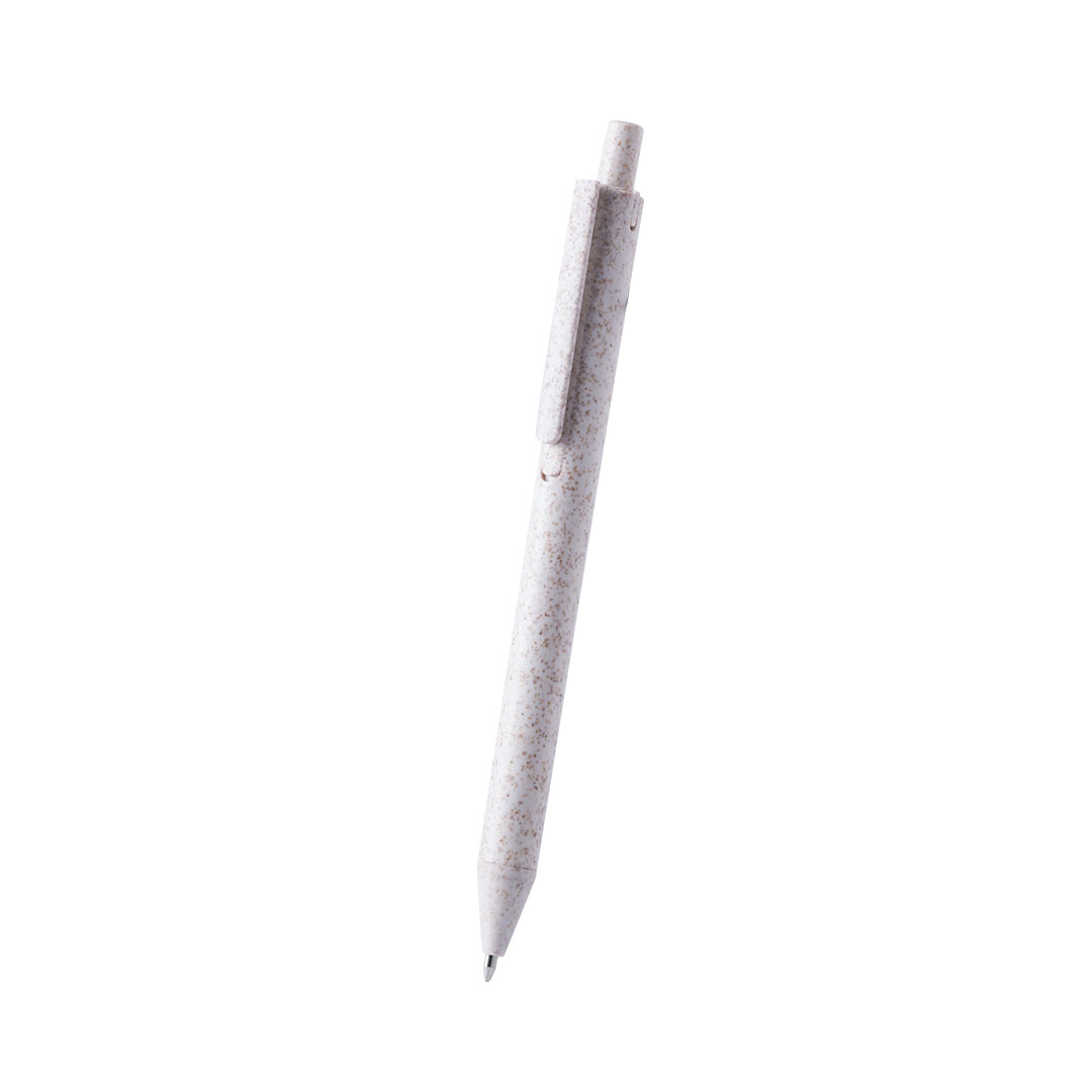 Esferográfica da linha Nature com corpo de cana de trigo, para promover o uso de matérias-primas naturais e reduzir as emissões poluentes. Design minimalista, com mecanismo de botão de pressão e clipe com grande superfície para marcação. Tinta azul.
