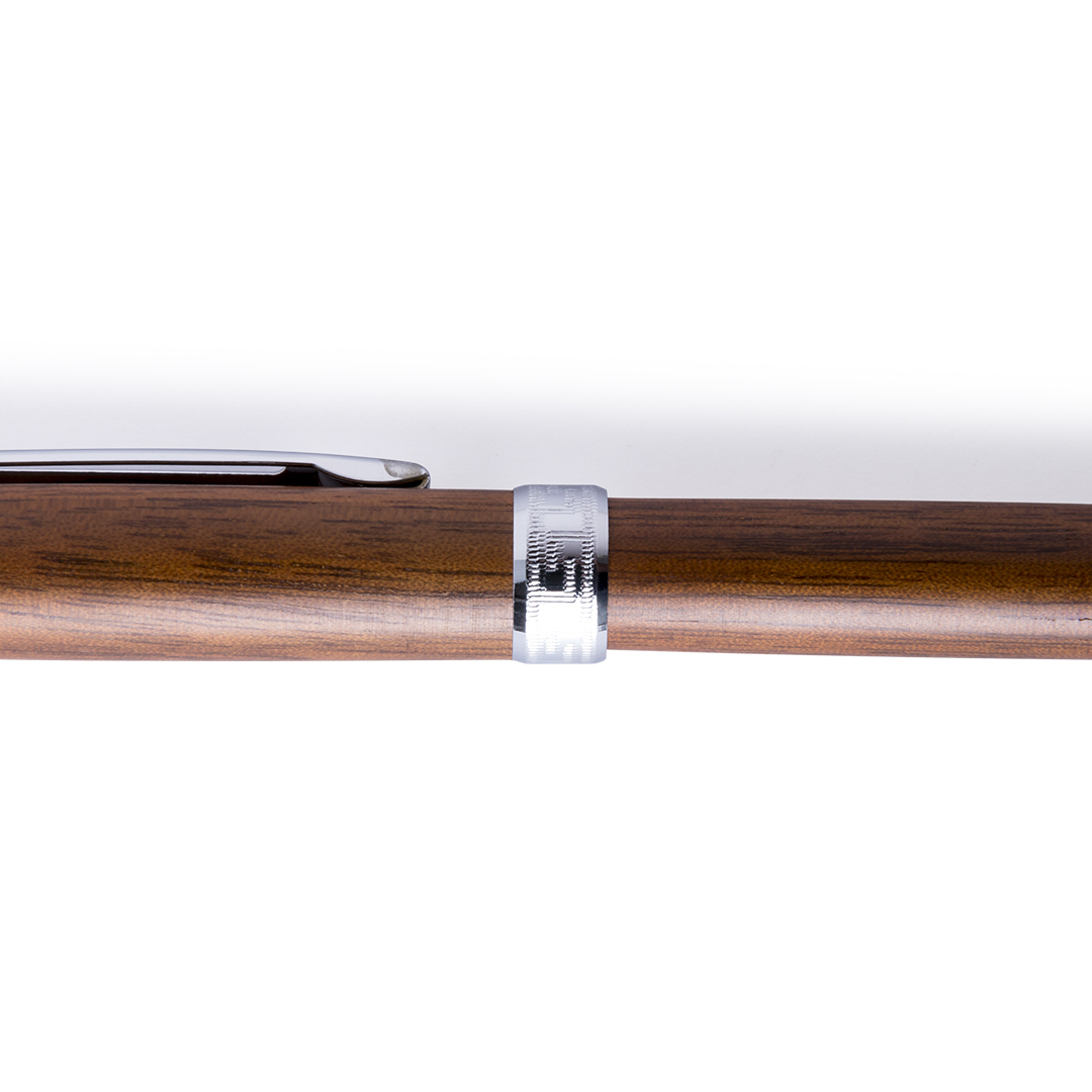 Esferográfica da linha Nature com corpo em nogueira. Com mecanismo de botão de pressão, com clipe cortado e detalhes em acabamento cromado. Cartucho jumbo e tinta azul.