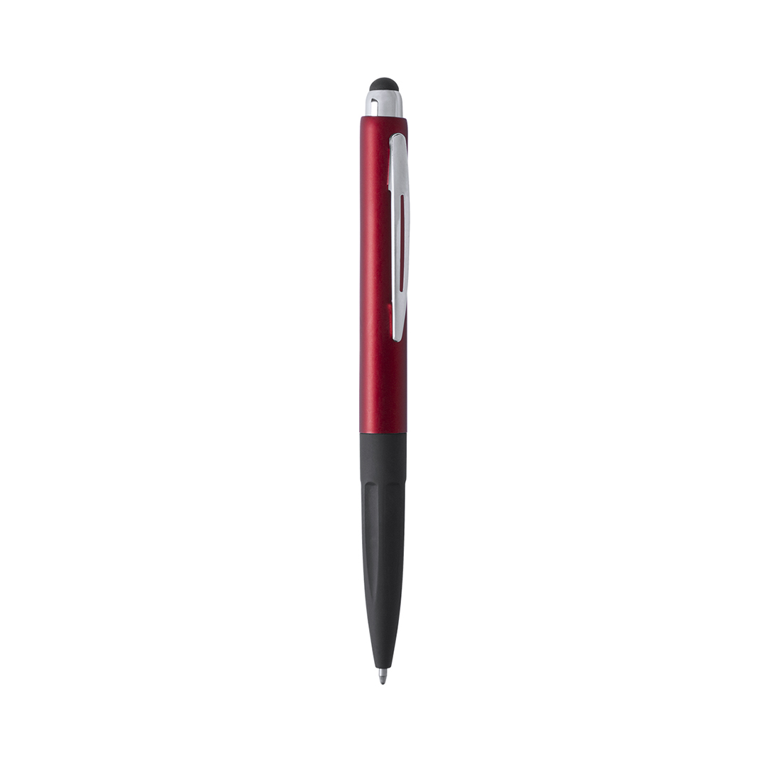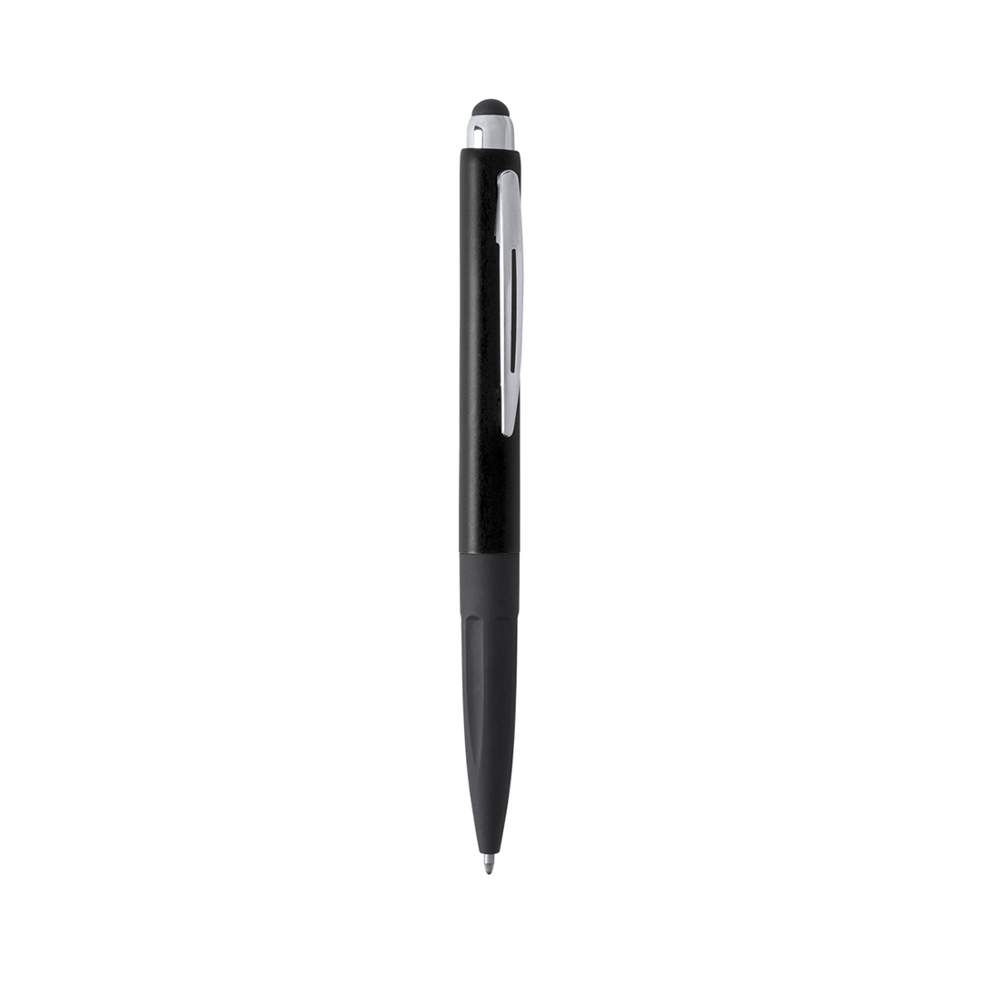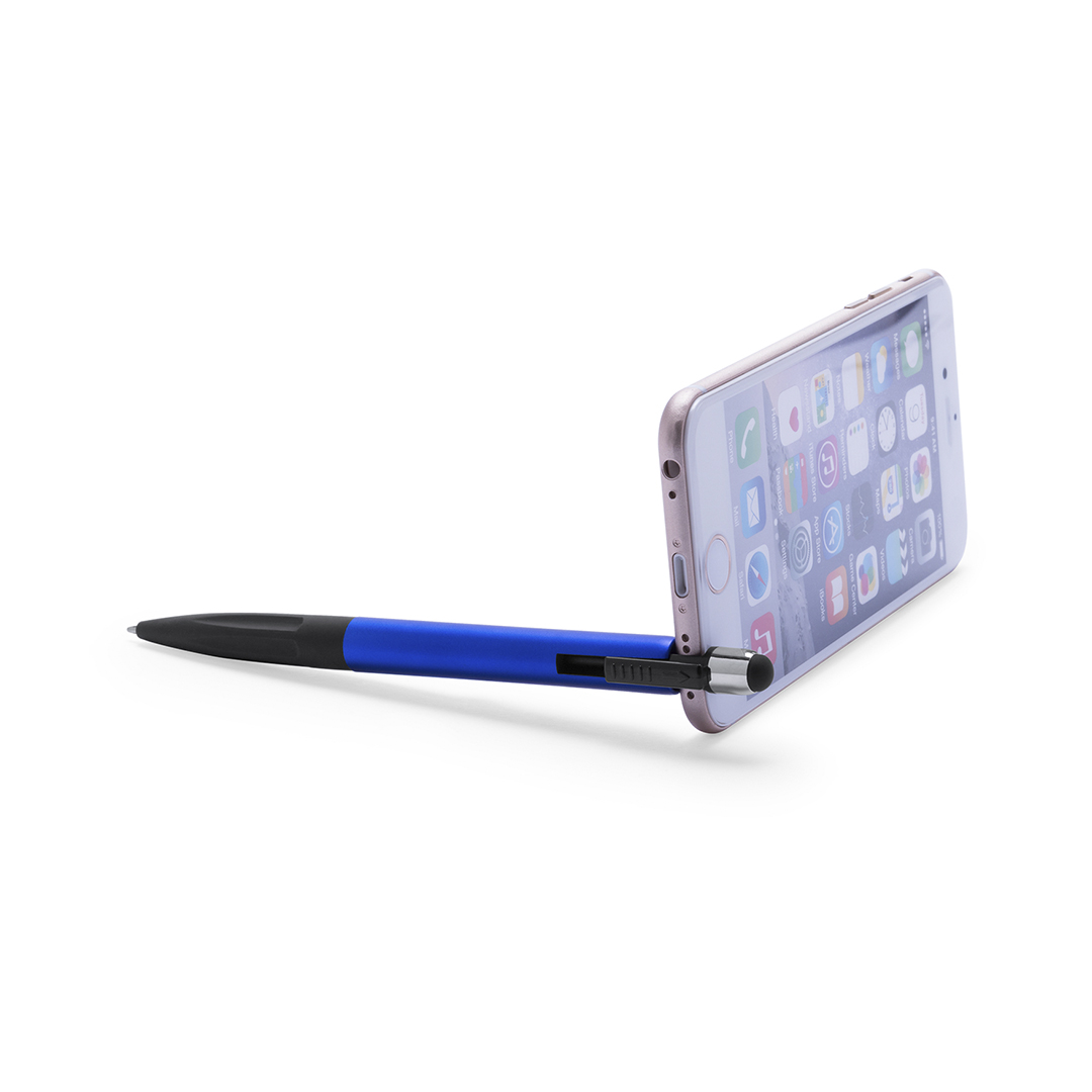 Esferográfica apontadora de mecanismo rotativo original com suporte retrátil integrado para dispositivo móvel. Design em cores elegantes, com um corpo de acabamento liso e especialmente projetado para impressão em bloco. Aderência confortável e tinta azul.