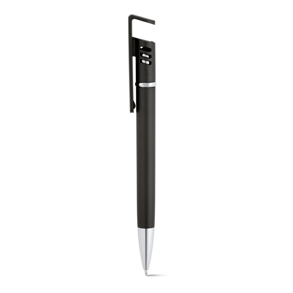 Esferográfica. Acabamento metalizado. Com ponteira touch e suporte para telemóvel.