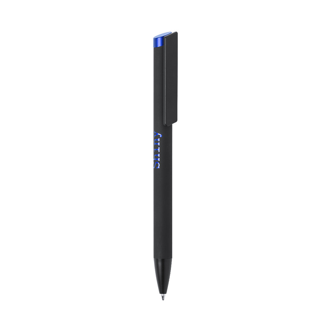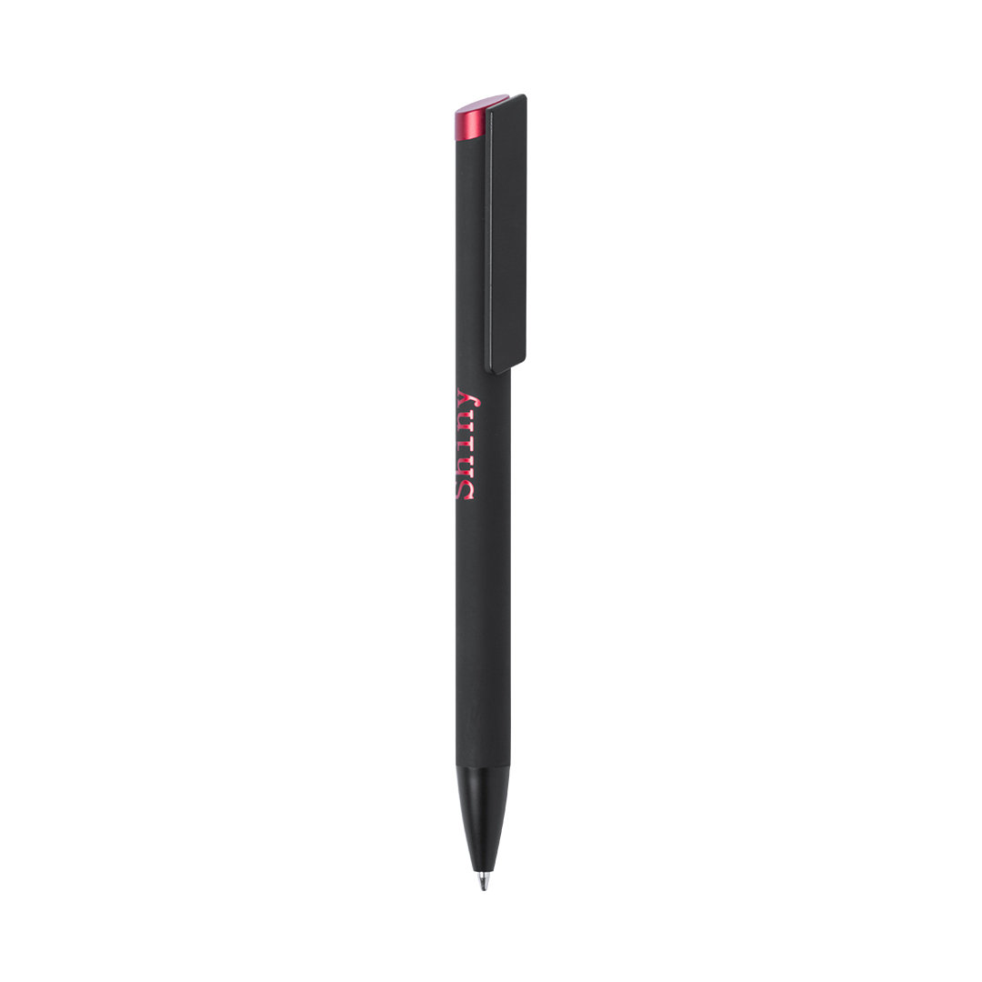 Esferográfica com botão de pressão com corpo sólido de acabamento em preto e anel superior numa ampla gama de cores metálicas com acabamento fosco. Clipe preto com uma grande superfície de impressão. Especialmente projetado para marcação a laser e com um revestimento externo especial para que sua marca seja gravada perfeitamente, combinando com a cor do anel superior. Cartucho jumbo e tinta azul.