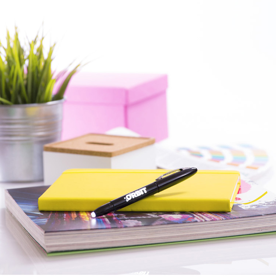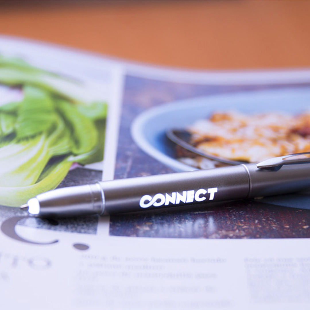 Esferográfica com luz led interna e corpo especialmente projetado para marcação a laser, iluminando assim o logótipo. Com um corpo macio numa ampla gama de cores metálicas e tinta azul. Pilhas incluídas.