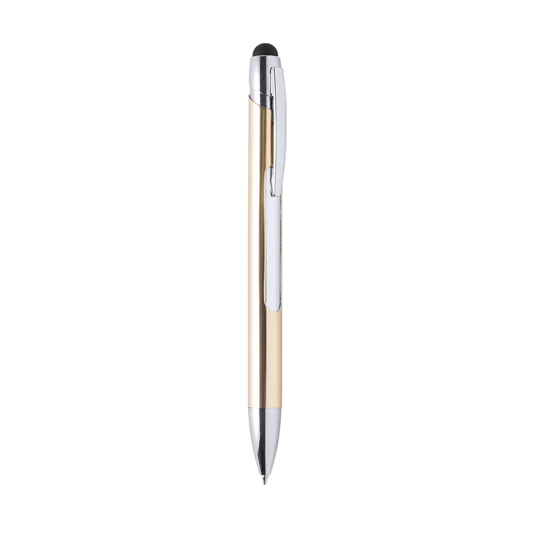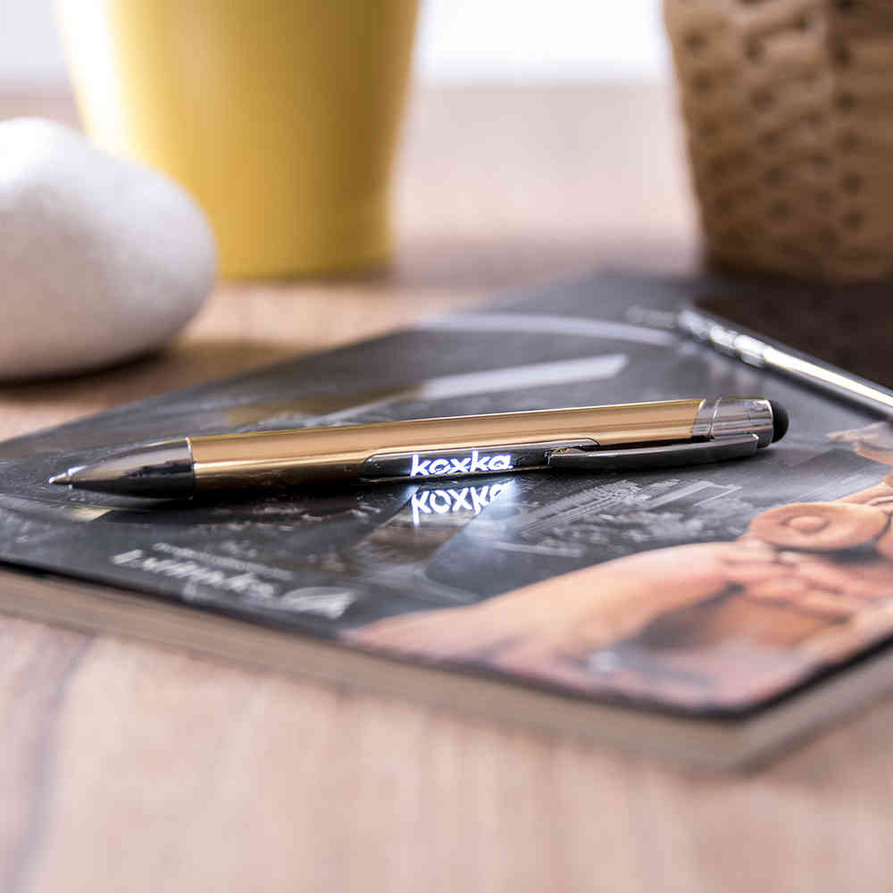 Esferográfica com botão de pressão, com interior iluminado e corpo em alumínio com um acabamento cromado suave. Área de marcação especialmente projetada para gravação a laser e, assim, garantir que sua marca seja originalmente iluminada com luz branca. Nas cores prata e ouro. 1 led, pilhas de botão incluídas e tinta azul.