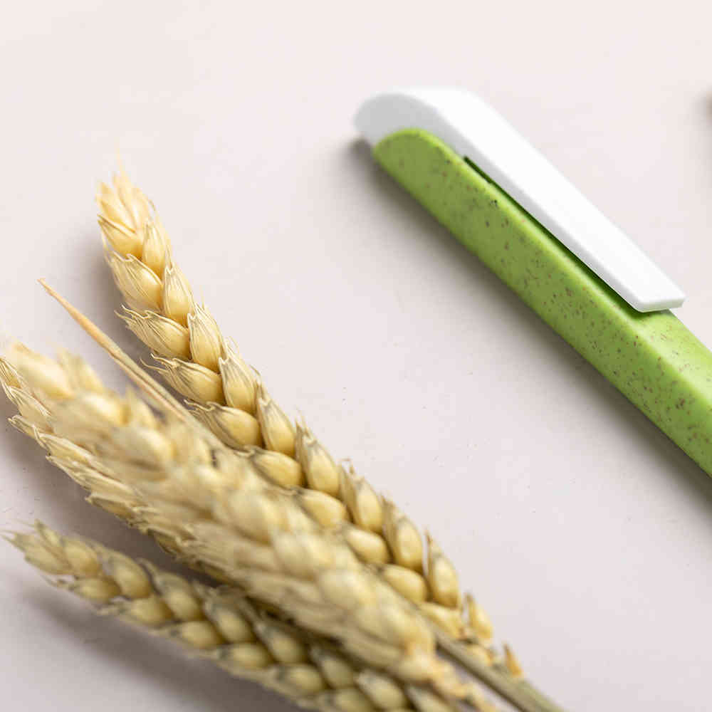 Esferográfica da linha Nature em cana de trigo, a fim de promover o uso de matérias-primas naturais e reduzir as emissões poluentes. Com clipe em branco especialmente projetado para impressão em almofada. Com mecanismo de pressão e tinta azul. Disponível numa ampla gama de cores da natureza.