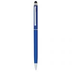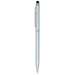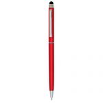 Esferográfica de plástico, touch e clip de metal. Escrita preta, sistema twist. Esferográfica de corpo fino, colorido. Clip metálico e detalhes prateados. Incluí touch.