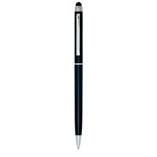 Esferográfica de plástico, touch e clip de metal. Escrita preta, sistema twist. Esferográfica de corpo fino, colorido. Clip metálico e detalhes prateados. Incluí touch.
