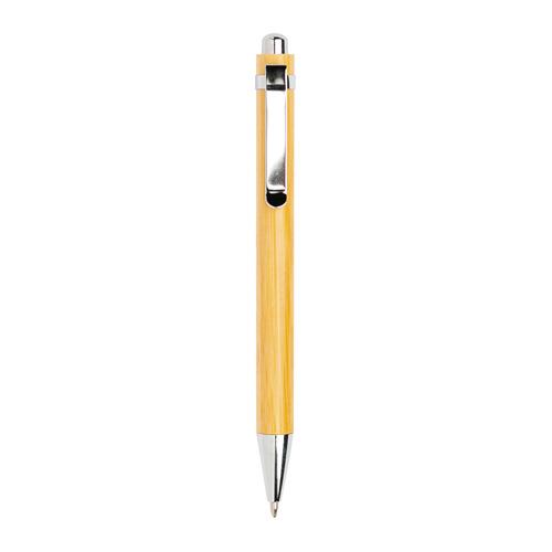 Esferográfica em bamboo com clip metálico. Escrita preta e sistema pulsar. Uma esferográfica elegante, ideal para personalização.