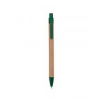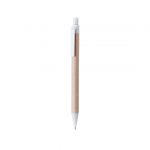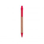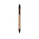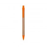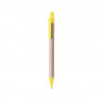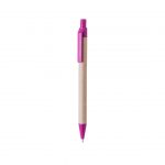 Esferográfica com mecanismo de flexão em uma combinação original de corpo em papelão reciclado de cor natural e acessórios em tons brilhantes. Tinta azul.