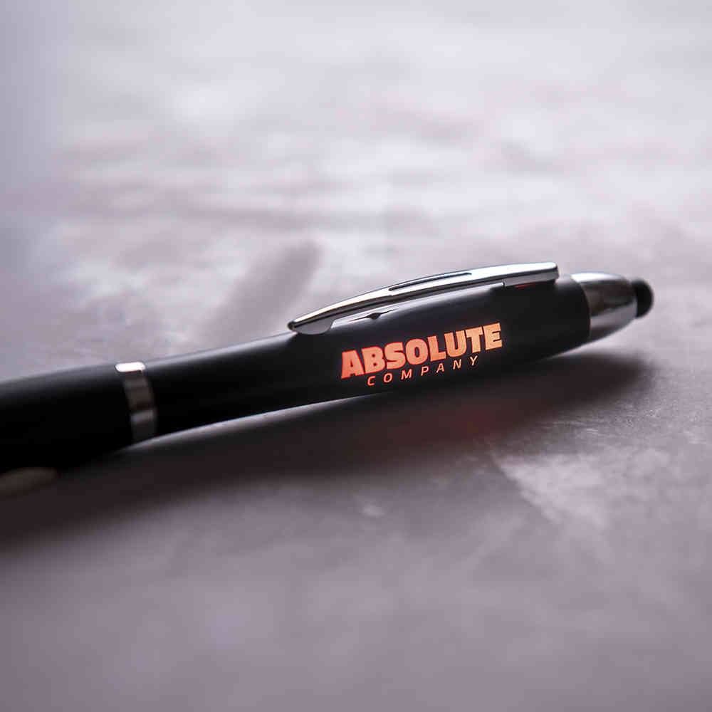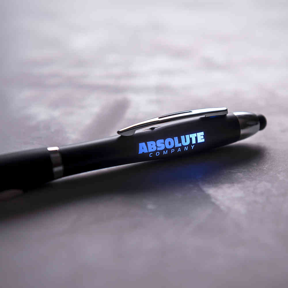 Esferográfica de mecanismo giratório com interior iluminado em várias cores e corpo de acabamento sólido em preto. Com luz led alternada de 5 cores e dois modos de iluminação. Área de marcação especialmente projetada para gravação a laser e, assim, garantir que sua publicidade ou marca seja originalmente iluminada com luz multicolorida. 1 led, pilhas de botão incluídas e tinta azul.