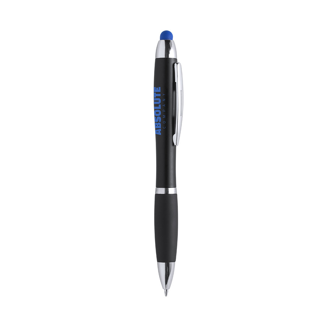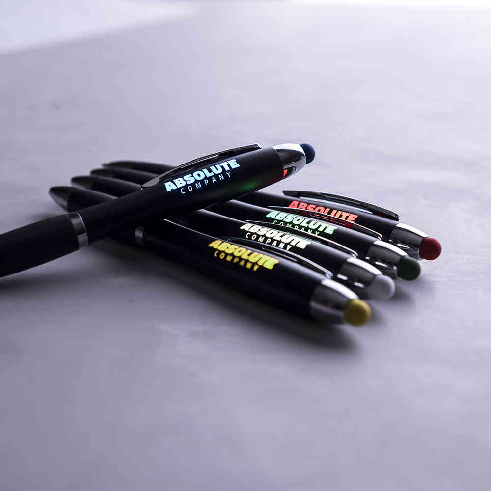 Esferográfica de mecanismo giratório com interior iluminado em várias cores, corpo de acabamento sólido na cor preta e ponteiro correspondente à cor da luz led. Disponível com luz led em amarelo, azul, branco, laranja, vermelho ou verde. Área de marcação especialmente projetada para gravação a laser. 1 led, pilhas de botão incluídas e tinta azul.