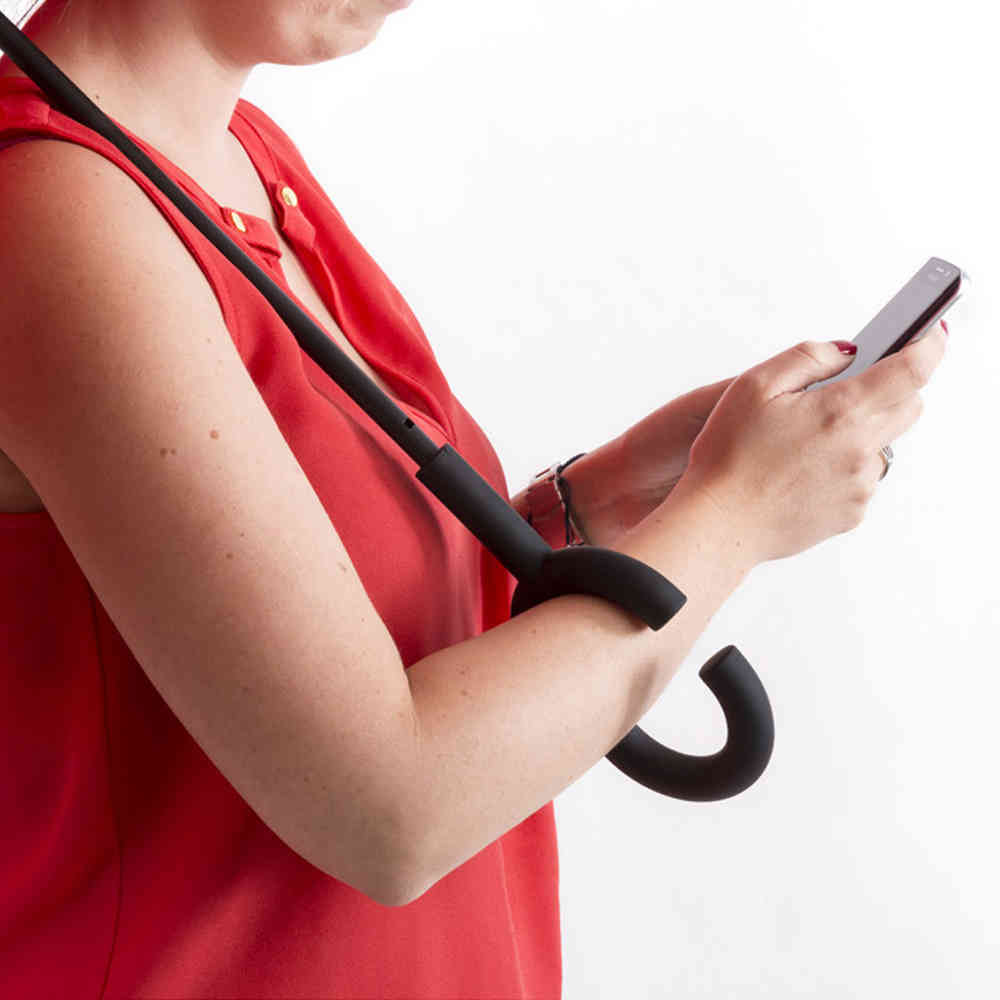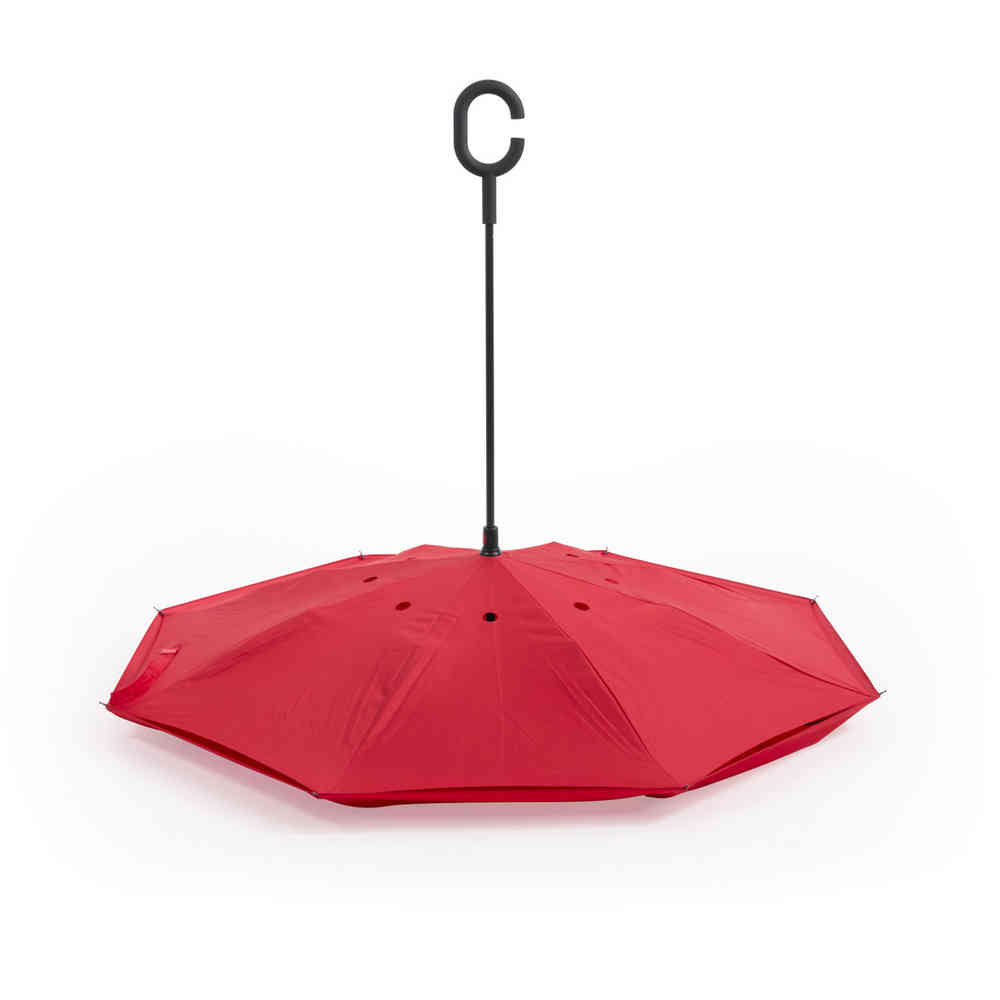 Guarda-chuva reversível de 8 gomos, em material resistente em pongee de cores vivas e com uma pega original mãos-livres. De 108cm de diâmetro, com abertura manual, hastes de fibra e fecho de velcro.