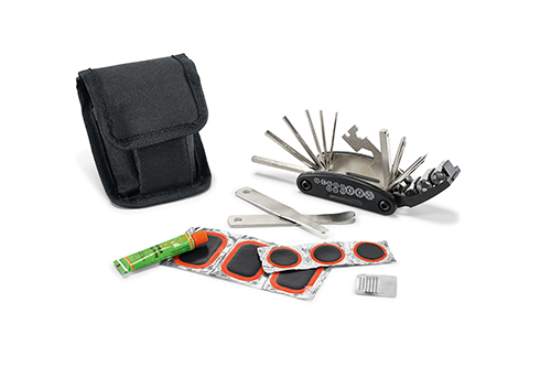 Kit de ferramentas para bicicleta com 11 chaves, 2 niveladores de pneu, 6 remendos para pneu, tubo de cola e raspador. Fornecido em bolsa de 600D.