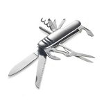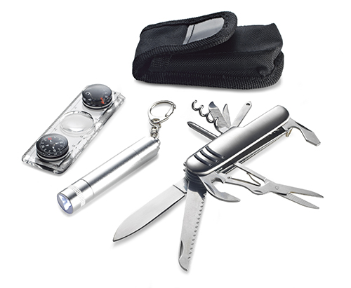 Kit outdoor. Aço inoxidável e metal. Com canivete multifunções (11 funções), bússola e lanterna (inclui 3 pilhas AG1).