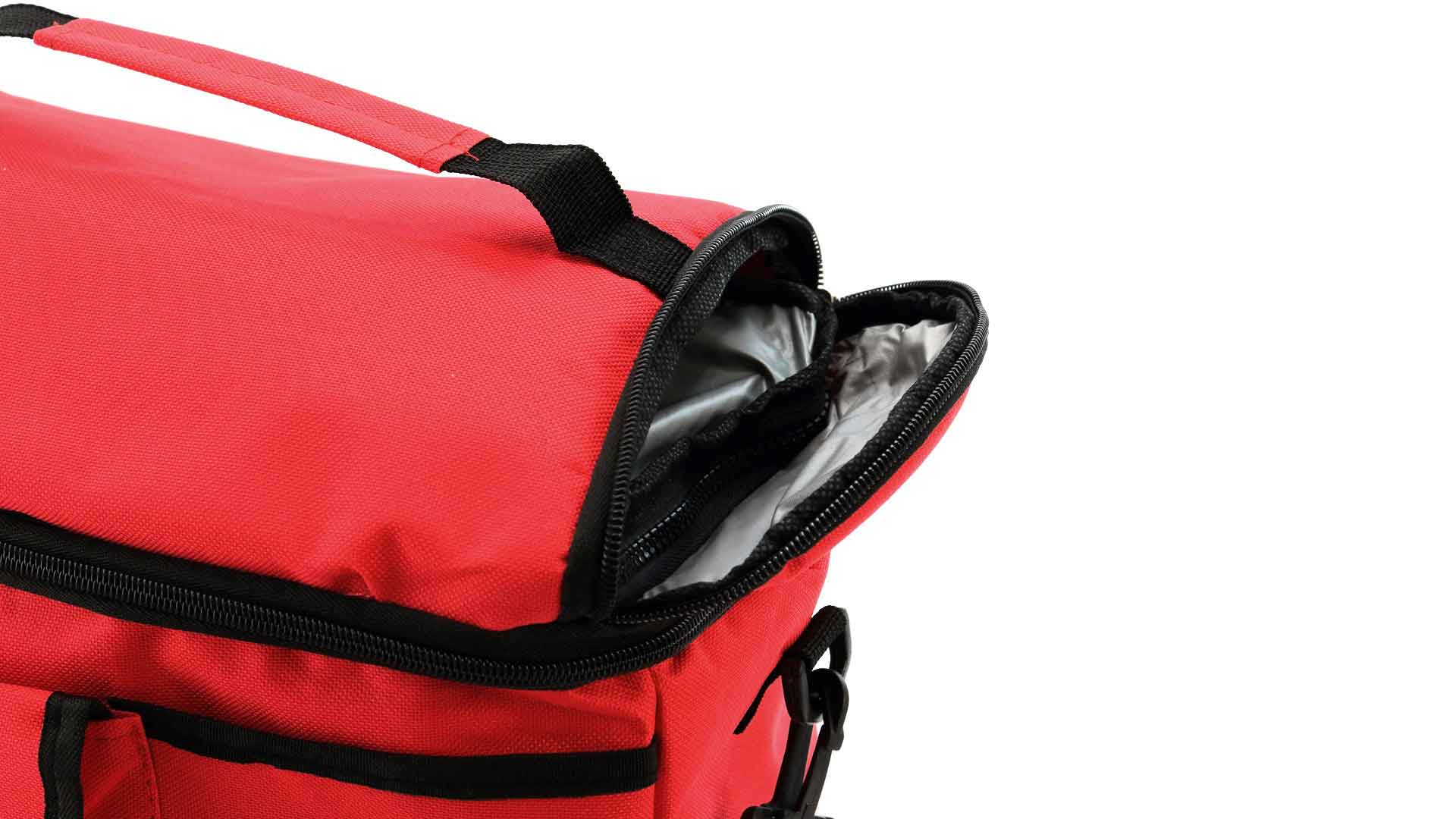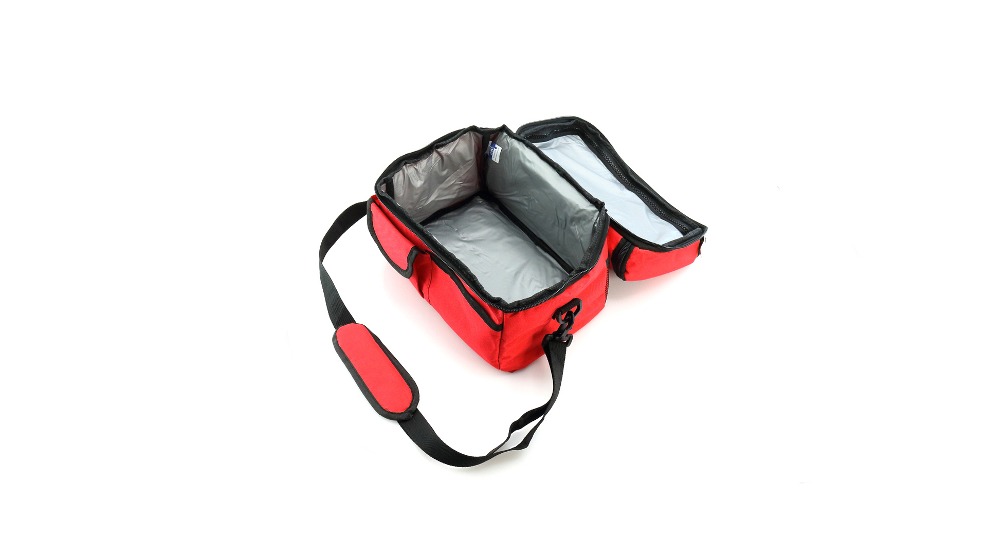 Lancheira off-road em poliéster 600D forte em cores brilhantes e com dois compartimentos com zíper independentes. Com 2 bolsos na frente, um com fecho de velcro e um bolso de malha elástica na parte de trás. Interior isotérmico com acabamento em alumínio. Com alça de ombro extensível com fecho mosquetão e alça de ombro acolchoada correspondente.