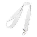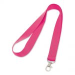 Lanyard em poliéster com mosquetão em metal.