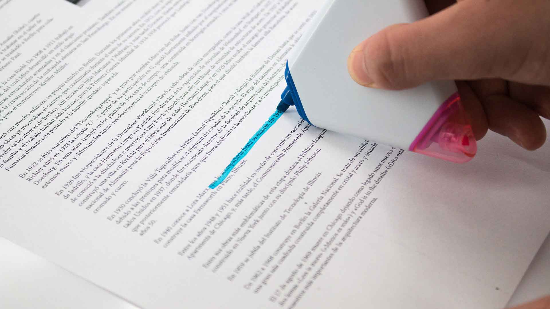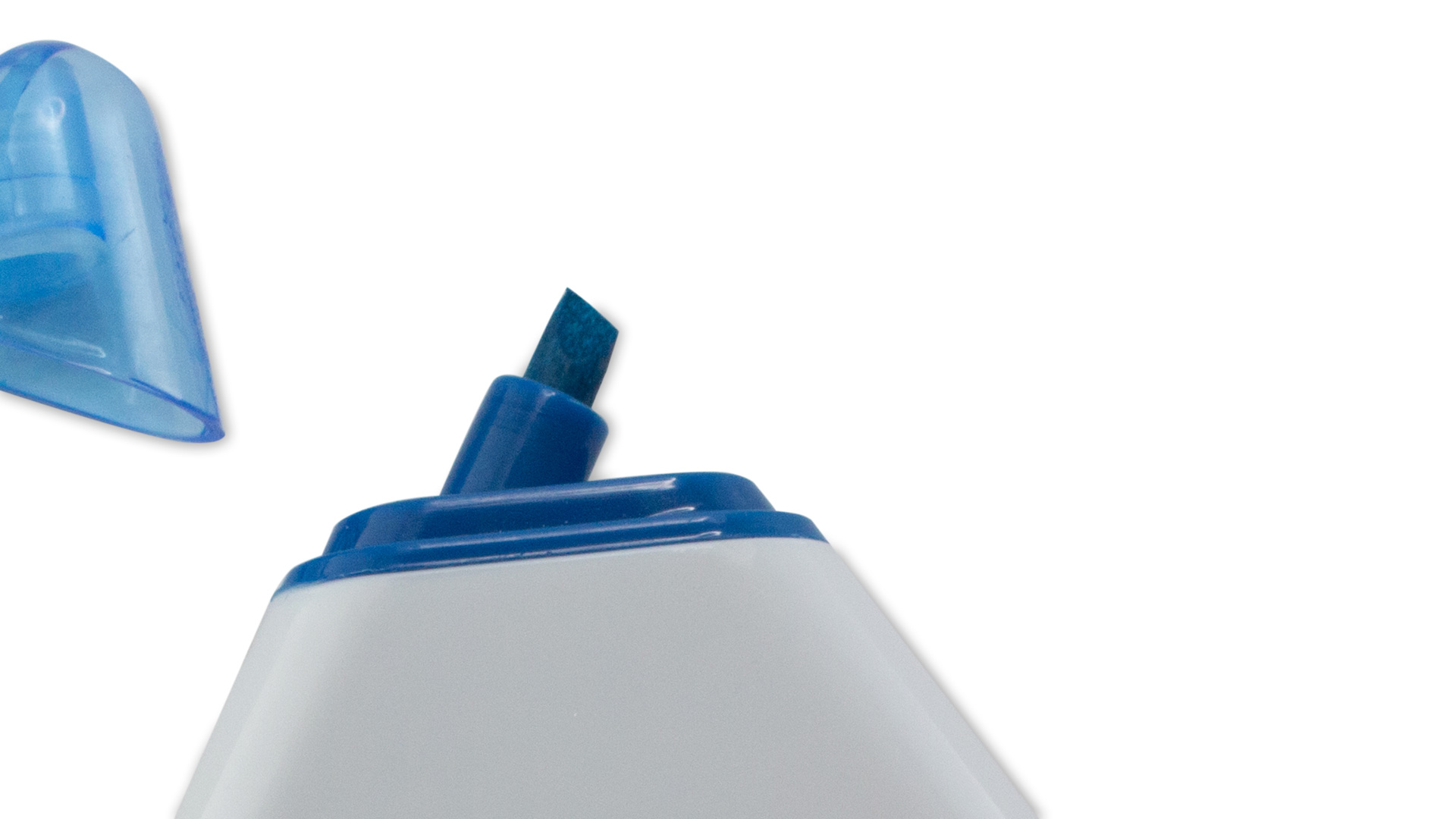 Marcador fluorescente de três cores original com corpo triangular num acabamento branco brilhante e suave, especialmente projetado para marcação digital em cores.