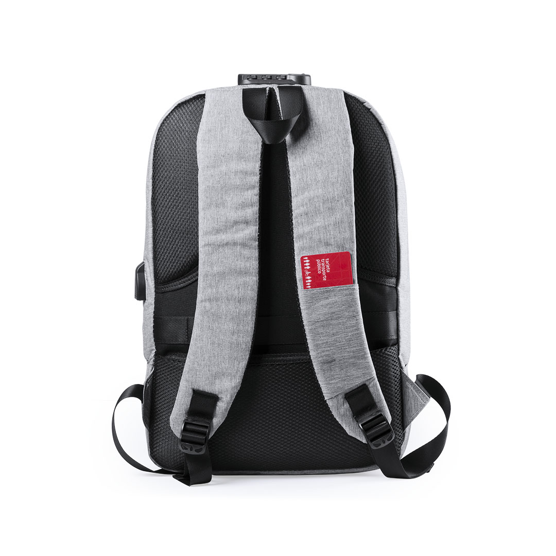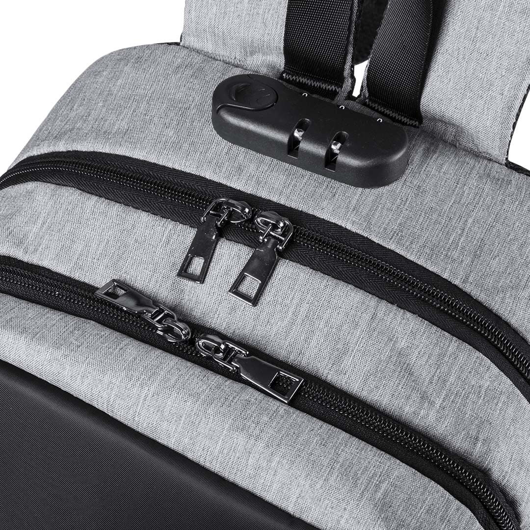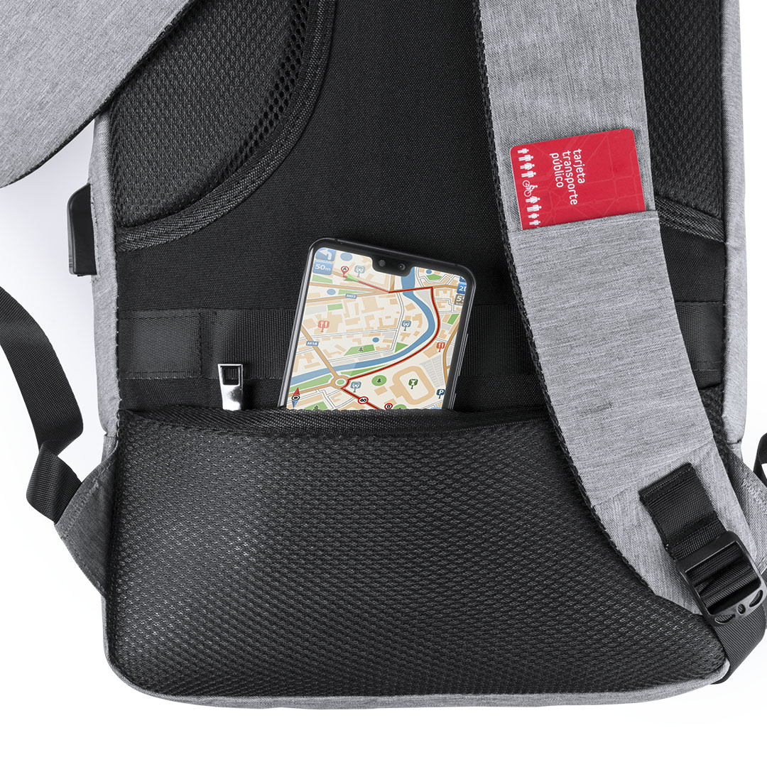 Mochila Business anti-roubo em poliéster 300D de alta qualidade. Tomada USB para carregamento - banco de potência não incluído - e bolso esquerdo com fácil acesso a cartões de transporte e outros documentos usados com frequência. Trava de segurança com senha. Dois compartimentos internos com zíper separados e um bolso acolchoado para laptops de até 15 polegadas. Com uma infinidade de bolsos interiores e exteriores e um bolso anti-roubo na parte de trás. Alças de ombro e costas com estofamento ergonómico. Com acessório para carrinho.